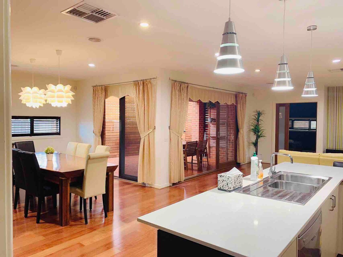 Esta encantadora casa de vacaciones de 5 estrellas se encuentra a 2 minutos de la autopista M8, a 5 minutos del centro comercial Derrimut, a 20 minutos del CBD y a 20 minutos del aeropuerto de Melbourne. Esta casa tiene 5 dormitorios, 2 baños, gran sala de estar, además de sala de ocio, sala Rumpus, aire libre delantero y trasero, área de despensa. Dormitorio principal, sala de ocio con hermosas vistas al parque. Bothwell Green Reserve justo enfrente de la casa, incluida la cancha de baloncesto, el parque infantil y el carril bici. La reservación de la empresa es bienvenida.