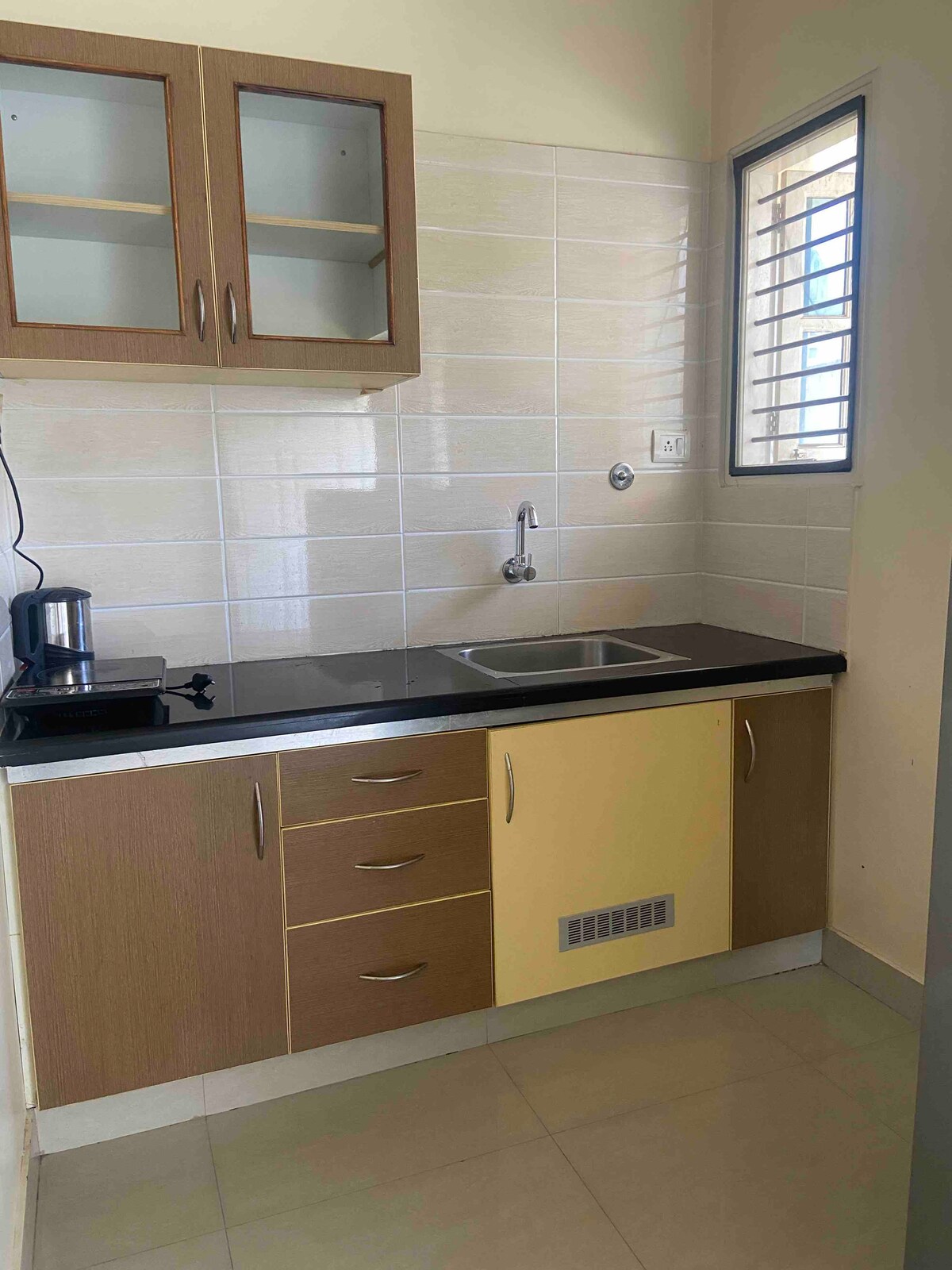Primera planta, una habitación con aire acondicionado (cargos adicionales basados en el uso real de aire acondicionado) con 2 camas y colchón Sleepwell, con baño privado, agua caliente las 24 horas, batería de respaldo UPS solo para luces y ventiladores (durante aproximadamente 4 horas), wifi de fibra, nevera, pequeña cocina con cocina de GLP de un solo quemador, pocos utensilios, hervidor eléctrico, lavadora, punto de carga de vehículos eléctricos.