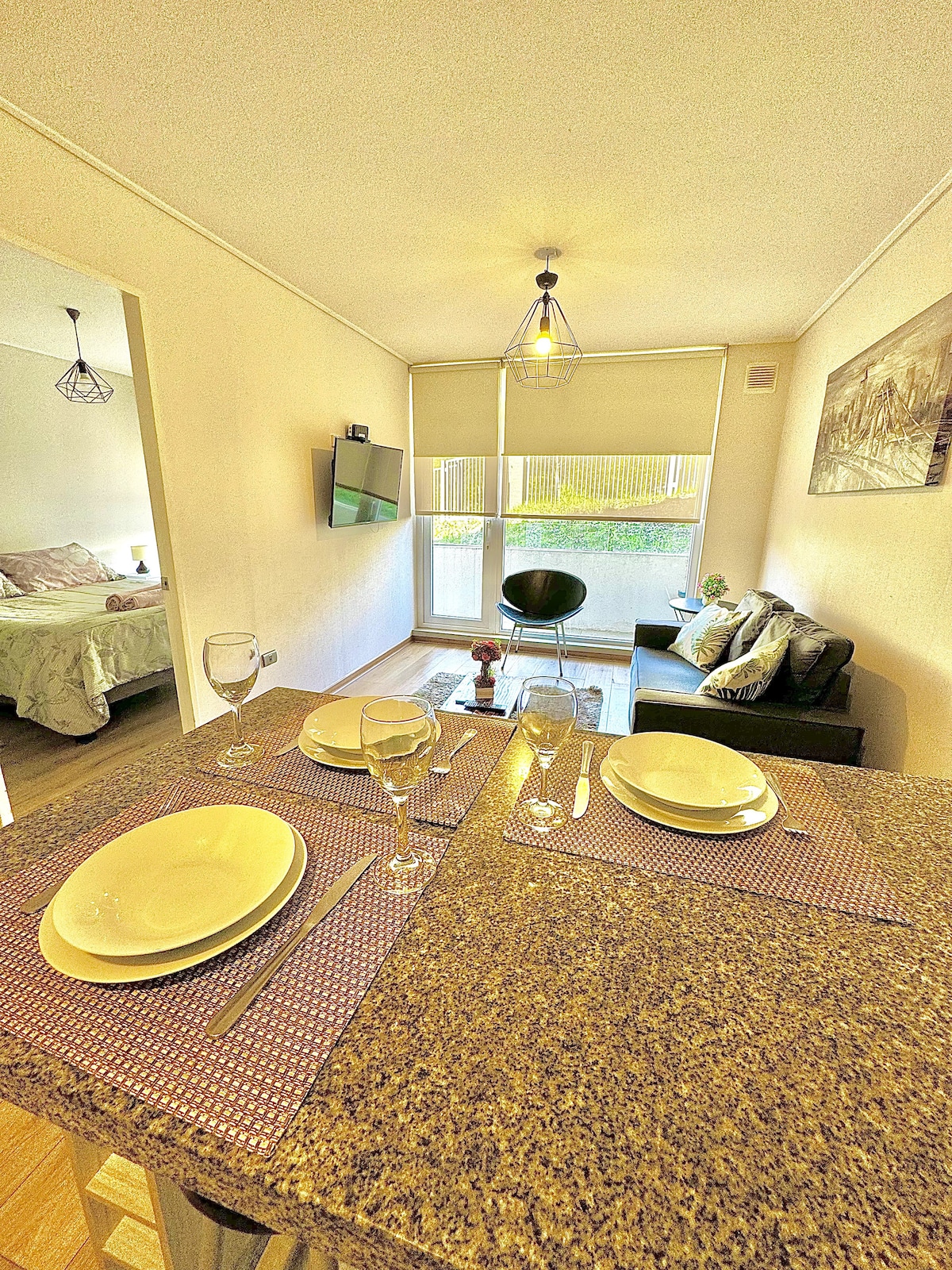 Departamento full equipado de un dormitorio, baño en suite. Cocina equipada, mesada de granito. Estacionamiento para 1 auto. Apto para 3 personas. Excelente ubicación, cerca de supermercados, banco, lavandería, pubs y restaurantes, centro comercial, y locomoción a la puerta. Hermosa vista a la Laguna Chica de San Pedro de la Paz. A 10 min del centro de Concepción, 12 min del aeropuerto, 15 min del Terminal de buses Collao. Portería 24 hrs.
