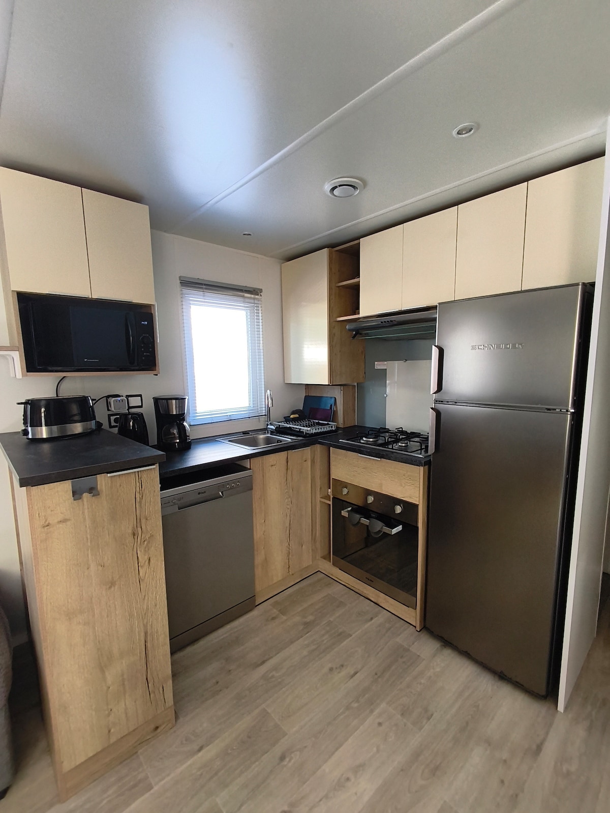 Casa móvil para 6 personas con 3 dormitorios, situado en el Camping de 3 estrellas La Baie du Kernic en Plouescat Finisterre Norte con una piscina cubierta climatizada de abril a septiembre y una piscina al aire libre abierta de junio a septiembre. La cocina equipada para 6 personas e incluye un microondas, una nevera, una placa de gas de 4 fuegos, mini horno, cafetera clásica, hervidor eléctrico +cafetera Dolce Gusto, TV. Terraza de madera con barrera con 1 mesa y 6 sillas.