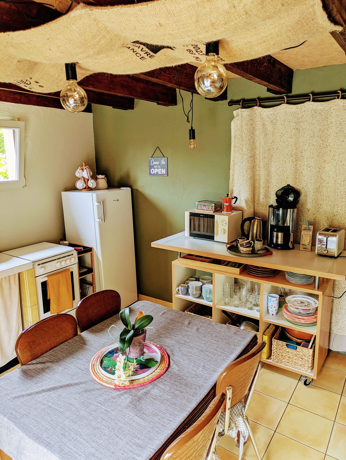 Nuestra yurta contemporánea está situada en el hueco de un huerto, a 2 km del mar. Con una superficie de 40 m2, su gran tragaluz y su ventanal hacen que sea un alojamiento muy luminoso. Está muy bien aislada, con una estufa de leña, para noches de coco junto al fuego durante todo el año. La ropa de cama se renovó en marzo de 2024 y es muy cómoda.