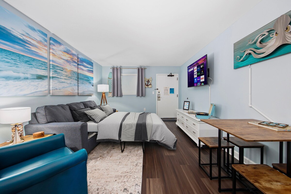 Completamente renovado en 2018, apartamento frente al mar con encimeras de cuarzo, armarios de estilo Shaker y electrodomésticos de acero inoxidable nuevos, sala de estar, comedor y dormitorio nuevos y muebles, suelos, TV gigante, cortinas nuevas, ropa de cama, iluminación, pintura y mucho más. ¡Es moderno, nítido, informal y cómodo! Hemos proporcionado muchas comodidades para el hogar y mucho almacenamiento para tus propias comodidades desde casa. ¡Ubicado en el corazón de MB y a pocos pasos de muchos restaurantes, cafeterías, bares, centro de convenciones, paseo marítimo y mucho más!