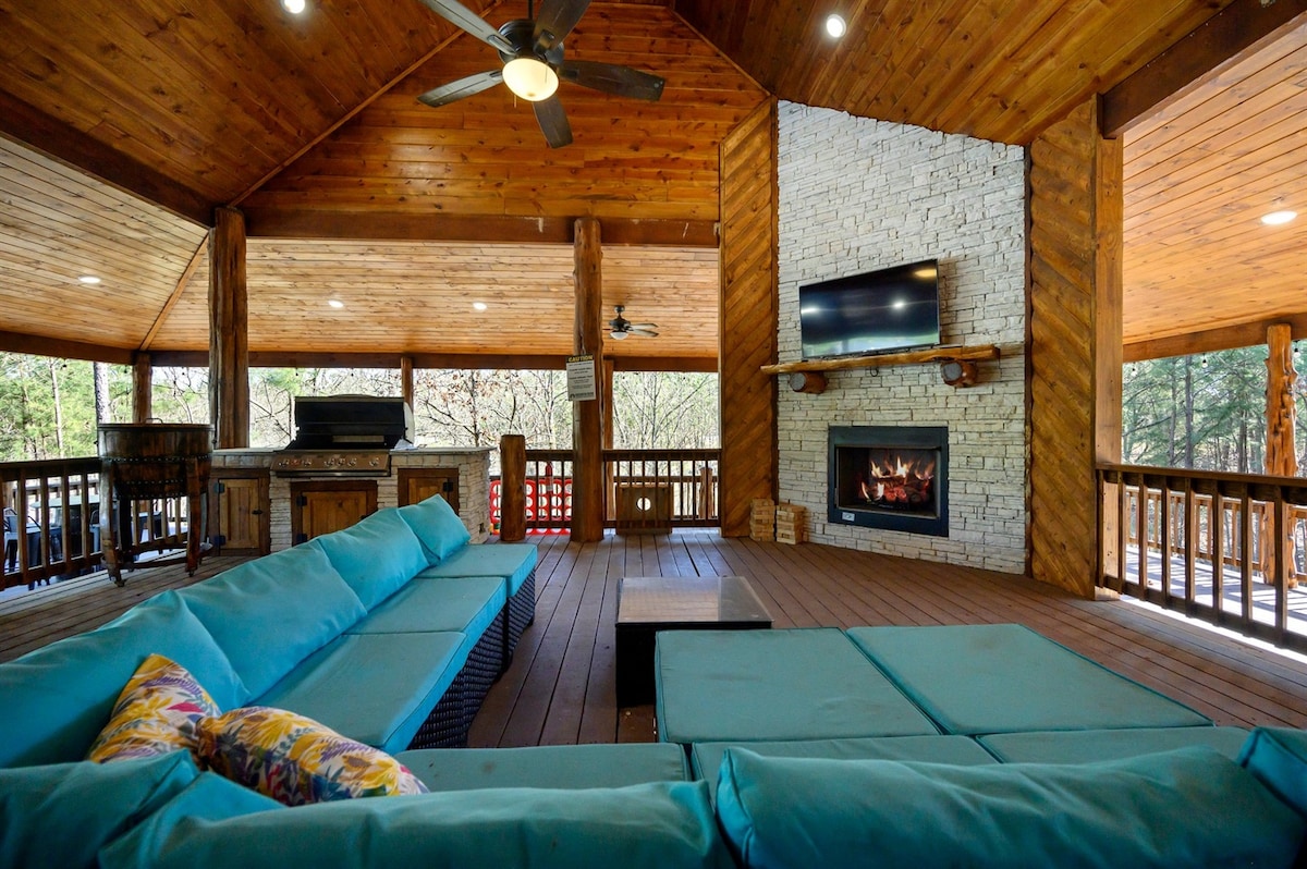 - Nueva cabaña de construcción moderna: los niños se divertirán deslizándose por la cubierta, jugando al aire libre y asando smores en el pozo de fuego. - Fogata, jacuzzi, piscina de inmersión de temporada, chimenea de gas y asientos en el patio exterior con TV de 65 pulgadas. - Escalador de geodomo, tetherball, herraduras y cornhole. - Suites dobles con cama tamaño king, baño privado y duchas dobles. - Habitación con litera separada en la planta superior. - Casino, tiendas de comestibles, parque estatal Beavers Bend, todo a unos 10 minutos, ubicado lejos del tráfico principal en Hochatown.