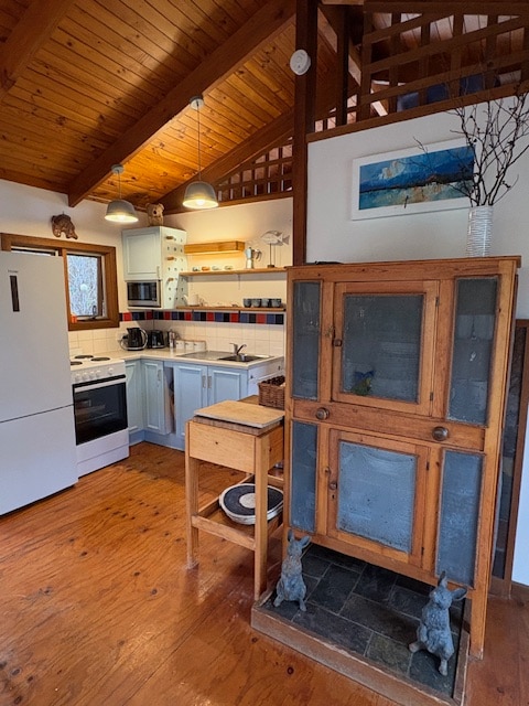 A spacious cottage with an exposed beam, cathedral ceiling living room, two queen downstairs bedrooms and an upstairs attic bedroom - set in a secluded, bush garden with grassy area - only 2 minutes to beach or walk along beach to town for good coffee. Please note, the garden is fully fenced and we do accept pets, however this does attract an additional fee of $40 per animal (regretfully, because of our many small birds, we do not accept cats).