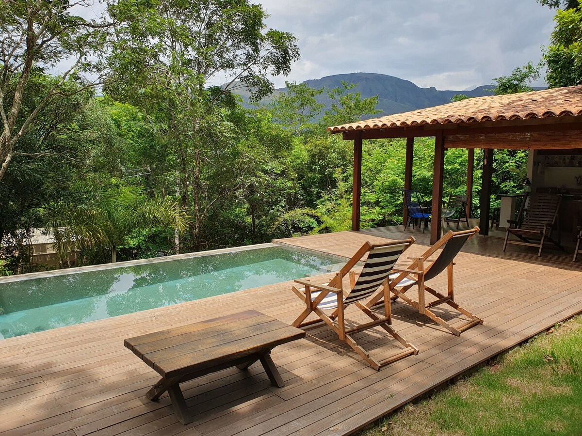 Casa de campo privativa de 120 m² em um terreno de 1600 m² próximo da rampa de vôo livre Topo do Mundo na Serra da Moeda. Lugar tranquilo na Mata Atlântica , todo cercado com tela para seu pet não fugir. Ideal para fins de semana em família com boa internet wi-fi para curtir a natureza com conforto da cidade. Casa com 4 quartos, sendo 1 suite. Curta um churrasco com piscina e música mas sem exagero no som alto e gritaria para não incomodar os vizinhos. NÃO É PERMITIDO FESTAS E EVENTOS.