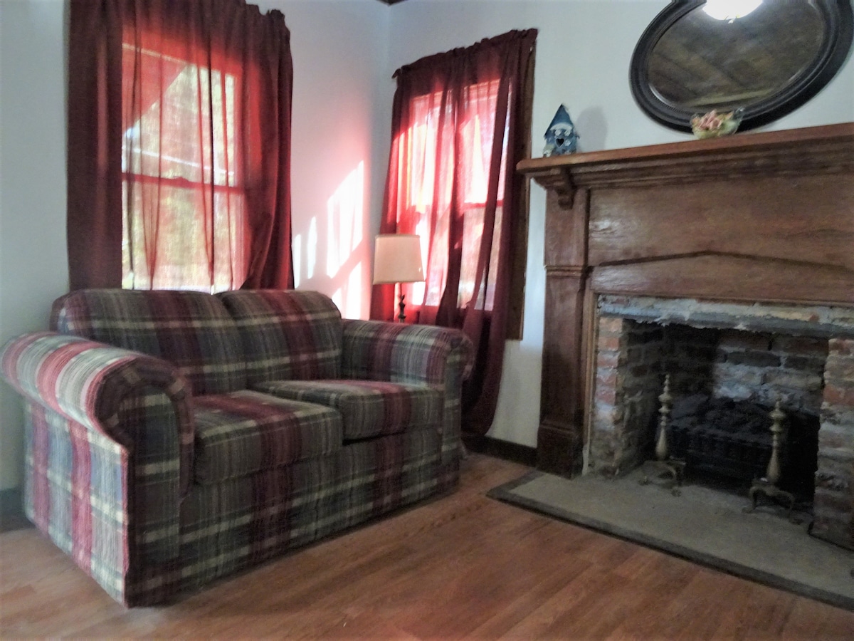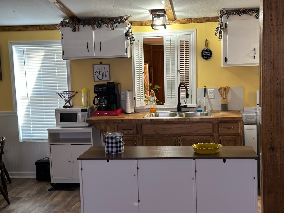 Disfruta de una taza de café relajándote en el columpio de la terraza delantera o sentado en la terraza trasera frente al bosque y observando a las gallinas picotear en busca de comida. O da un paseo por el camino e inspecciona las vides de muscadine/scuppernong y disfruta de deliciosas uvas e higos en temporada. Disfruta de una porción de vida en el campo en 2 1/2 acres.