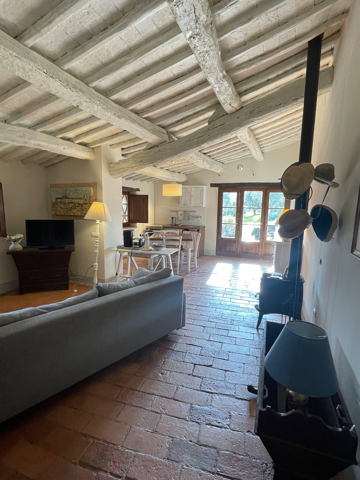 Una joya de apartamento en el corazón de la Toscana. Impresionantes vistas a los cipreses y olivos. Techos con vigas, suelos de mármol, todo recientemente reformado. El apartamento incluye una cama de madera antigua y luces venecianas. Puedes relajarte y comer al aire libre en tu propio jardín privado, donde se proporcionan tumbonas, una barbacoa y una zona de comedor a la sombra, disfrutando de las hermosas vistas.