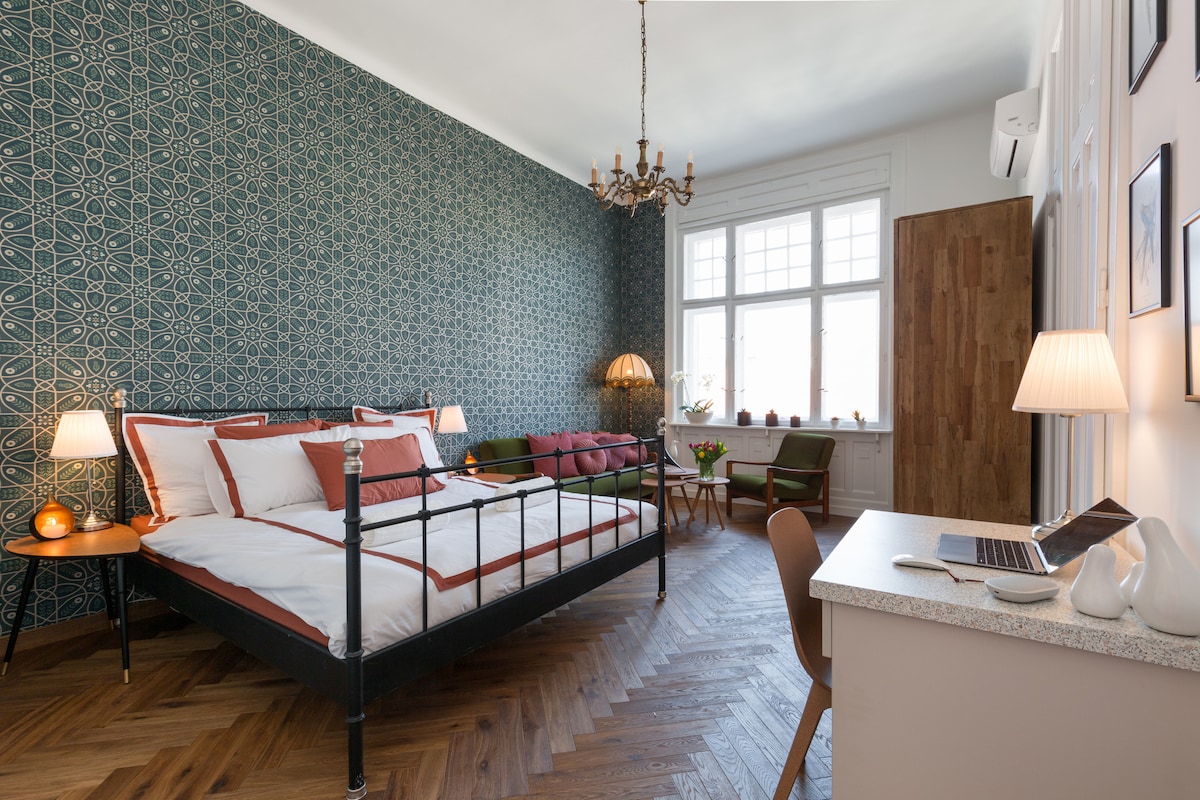 Our Luxurious Designer Residence has two bedrooms, hosts up to six guests in three beds, a king and two queen size beds, it is located in the centre with many cafes, bars & restaurants around in the historic Jewish District. The building is one of the most beautiful palaces of Budapest with an incredible green courtyard. The Residence is air-conditioned & has a full bathroom, a separate extra toilet & a fully equipped kitchen & dining room. The building & the apartment both recently restored.