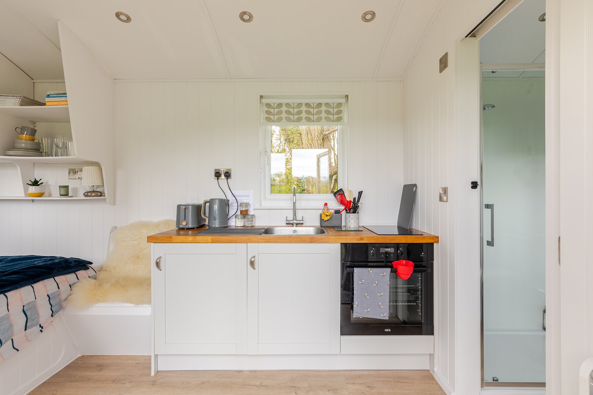 Bienvenido a nuestro hermoso carromato de pastor. Perfectamente proporcionada con una cama doble, cocina totalmente equipada y baño, todo en su propio jardín privado cerrado. La cabaña tiene una cama doble, mesa de comedor y sillas boutique, cocina con horno, parrilla, vitrocerámica, nevera, hervidor y tostadora. Tiene su propio calentador de agua, radiador y toallero eléctrico. El baño también tiene un gran espejo y una gran ducha eléctrica. El carromato está situado en su propio jardín privado de césped con vistas a nuestros campos.
