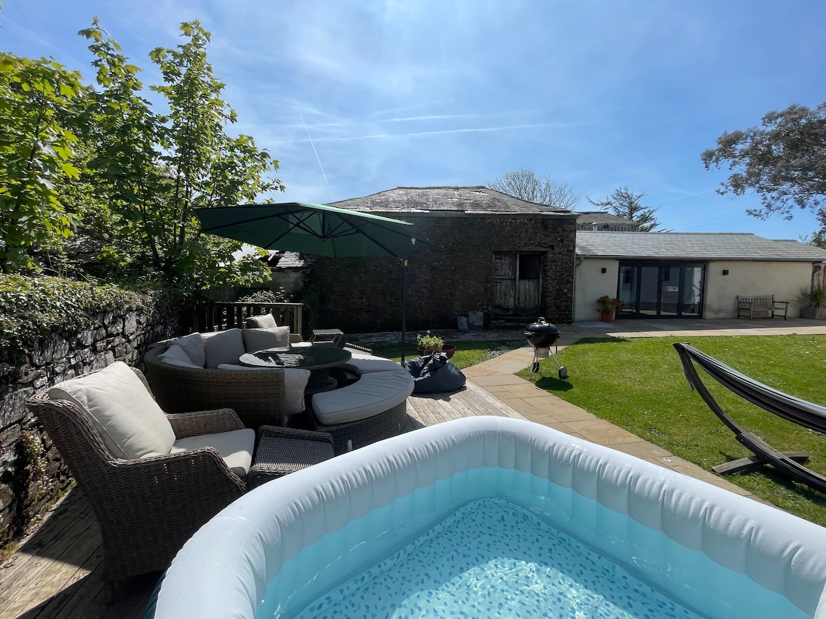 Este granero privado tiene todo lo necesario para un retiro tranquilo. En una finca tranquila y privada, a solo 10 minutos en coche de las playas de Bude. Haz uso de la casa de la barbacoa, las duchas al aire libre, el brasero, el jacuzzi y la sauna antes de instalarte junto a la estufa de leña y la televisión inteligente. Perfecto para parejas. No se admiten bebés ni niños menores de 12 años. 2 huéspedes acceden al dormitorio principal y al baño privado, grupos de 4 acceden a ambos dormitorios/baños. Solo 1 perro. Jardín cerrado, a prueba de perros. Imprescindible para un retiro relajante y para desestresarse.