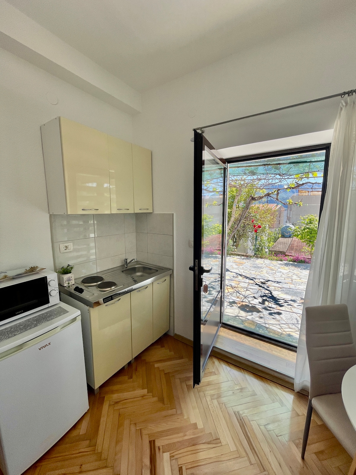 Relájate en este cómodo y espacioso estudio en una casa familiar con un enorme jardín verde y amplias terrazas. A 10 minutos a pie de la famosa plaza Becicka (playa). Bonito lugar para descansar después de un caluroso día de verano y desayunar tranquilamente en una terraza. El estudio está equipado con una pequeña cocina y todos los servicios necesarios para unas cómodas vacaciones de verano. Zona apta para niños y mascotas, con mucho espacio al aire libre y sombra natural, algo que es bastante raro de encontrar en Budva.