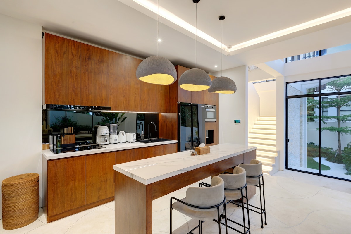 Villa Luxe de 4 dormitorios con vista al mar: • 4 elegantes habitaciones, cada una diseñada para la privacidad y la calma • 5,5 baños (dos baños) con servicios premium • Salón de planta abierta, tres plantas conectadas por un ascensor • Cocina totalmente equipada + segunda cocina junto a la piscina • Amplia piscina infinita con vistas al mar • Terraza solárium en la azotea • Salas de cine y gimnasio • Limpieza diaria con toallas y sábanas limpias • Servicio de conserjería: spa, excursiones y más • Sala de personal separada • Se aplican términos especiales para eventos y celebraciones