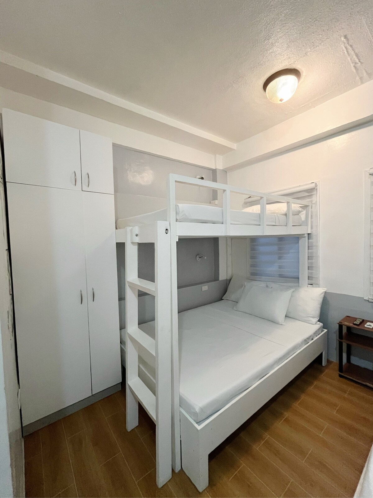 Este es un dormitorio frente a la playa ACREDITADO POR PUNTOS que está amueblado con gusto con arte local y está equipado con comodidades convencionales, como aire acondicionado, duchas frías y calientes y TV de pantalla plana. La acogedora cama tamaño queen está vestida con sábanas blancas y limpias y tiene mesas auxiliares minimalistas en ambos lados. El apartamento cuenta con balcón que ofrece excelentes vistas de la playa Bulabog. La estación 2 de White Beach está a menos de diez minutos a pie.