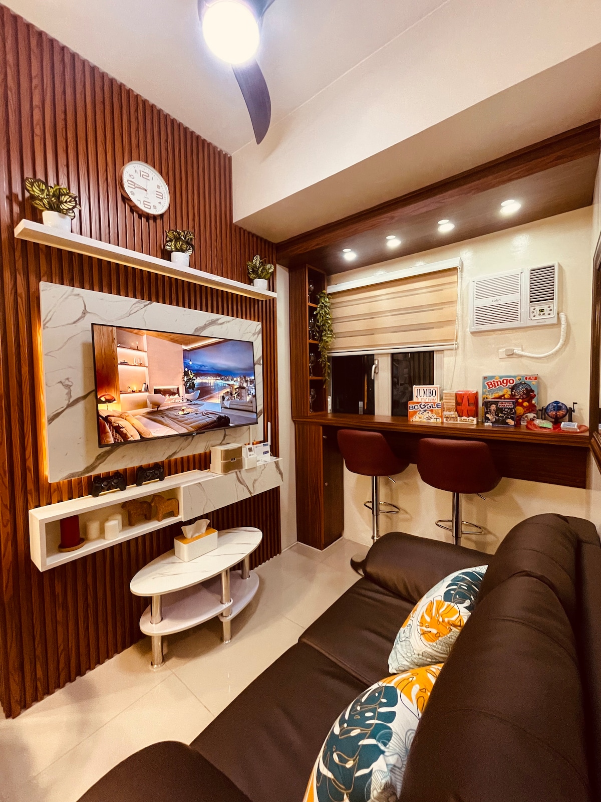 Hotel Staycation de estilo loft de 52 m² Unidad de aire acondicionado de 2,5 HP (2F) y 1,5 HP (GF) Características principales: Kitchen totalmente funcional Refrigerador y horno microondas Cocina de inducción con campana extractora Juego completo de utensilios de cocina Baño con regadera Mesa de comedor de 4 plazas Dormitorio: ideal para 4 personas (cama doble completa con cama semidoble extraíble) Billares ilimitados Máquina arcade (2 PHP = 3 minutos) Pantalla de Android TV: Netflix, YouTube, etc. Juegos de mesa, cartas, etc. Mini karaoke Minibar