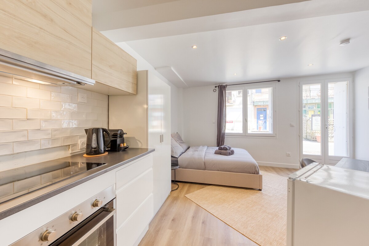 El alojamiento: F2 de 38 m² totalmente renovado que incluye: - una sala de estar con zona de estar sofá, TV, acceso a Internet a través de wifi, una cocina equipada con horno y placas eléctricas, microondas, nevera/congelador, cafetera, tostadora, hervidor de agua, vajilla, vajilla y todo lo necesario para cocinar o calentar. - una habitación con cama doble y vestidor disponible - un cuarto de baño (ducha, secador de pelo) y un inodoro separado Se proporcionan sábanas y toallas Acceso privado con aparcamiento cerrado