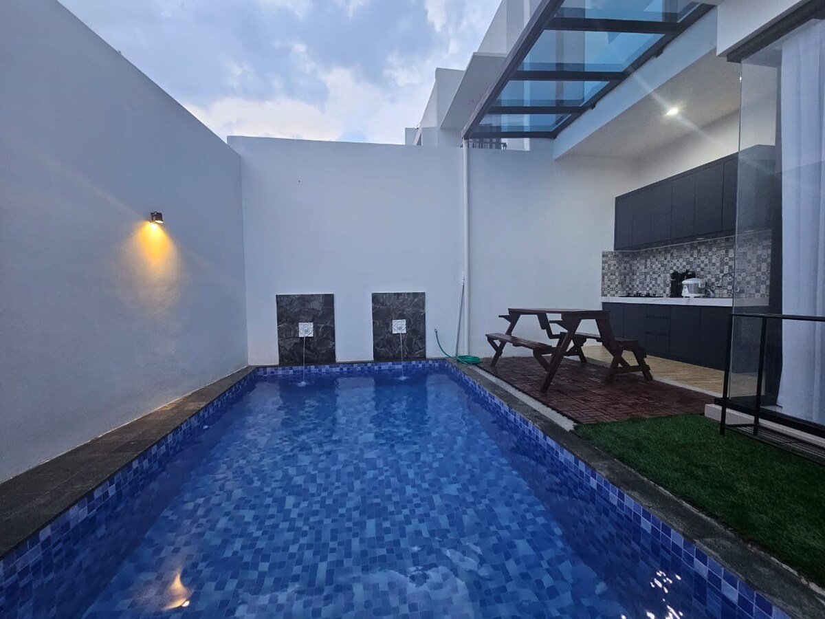 Bienvenido a Reindhita Bliss Villa, una moderna villa de 2 plantas con un ambiente acogedor en medio de la fresca ciudad de Batu. Perfecto para vacaciones en familia o con amigos. *Servicios principales 3 KT, 4 kM con calentador de agua Piscina privada Sala de karaoke + YouTube Premium Cocina y zona de barbacoa Wifi gratuito, Smart TV y lavadora Estacionamiento comunitario seguro *Capacidad Cómodo para 8 personas + cama supletoria *Ubicación conveniente A 5 minutos de Jatim Park 3 y BNS A 10 minutos del parque Jatim 1 A 12 minutos de Batu Square