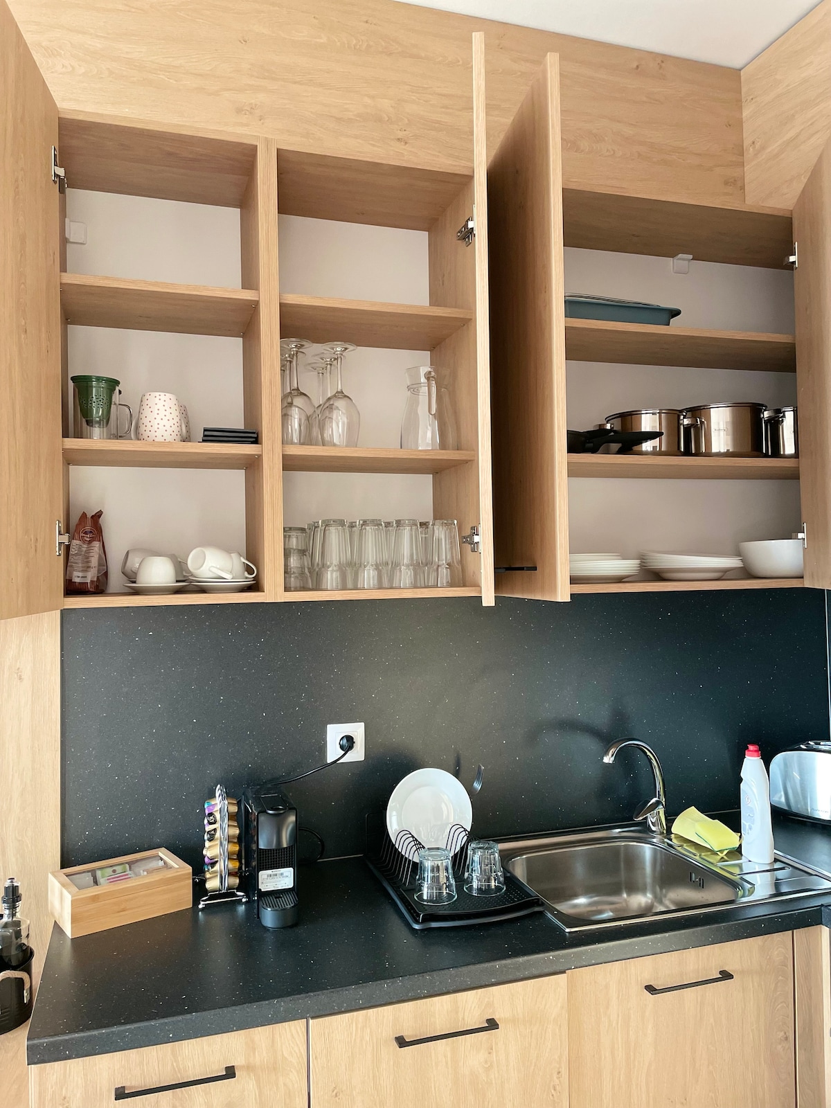 El complejo Santa Marina ofrece 5 piscinas con jacuzzi, increíbles jardines verdes, restaurantes, bares y cafeterías. Si añadimos las dos playas cercanas, ¡este lugar hará de tus vacaciones una experiencia increíble! Nuestro acogedor apartamento consta de una sala de estar junto con una cocina elegante y un comedor. Al otro lado del apartamento está el dormitorio (cama tamaño queen) con una gran terraza con una maravillosa vista al mar. El baño tiene una cabina de ducha junto con un inodoro.