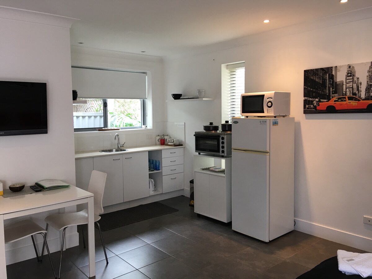 Estudio bien equipado con aire acondicionado a 2 minutos en coche del corazón de Palm Beach, a medio camino entre la hermosa Tallebudgera y Currumbin Creek. Aproximadamente a 10 minutos a pie de la playa. Se permiten mascotas pequeñas de buen comportamiento de menos de 10 kg. Esta propiedad es buena para personas que viajan solas o parejas con un sofá cama que es adecuado para niños menores de 10 años. Totalmente independiente, a excepción de una lavandería. Aparcamiento gratuito en la calle. Wifi gratuito.