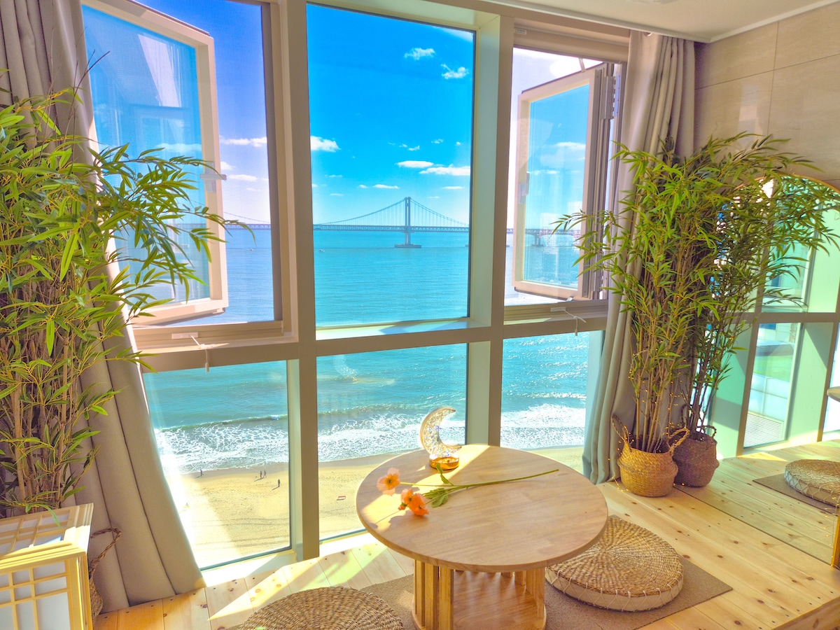 [NUEVO descuento de inauguración] Vista completa al mar desde el Puente Gwangan, habitación n.º 3, ropa de cama de hotel, junto a la playa, zona popular de Busán, Millak The Market, relajación, estacionamiento gratuito