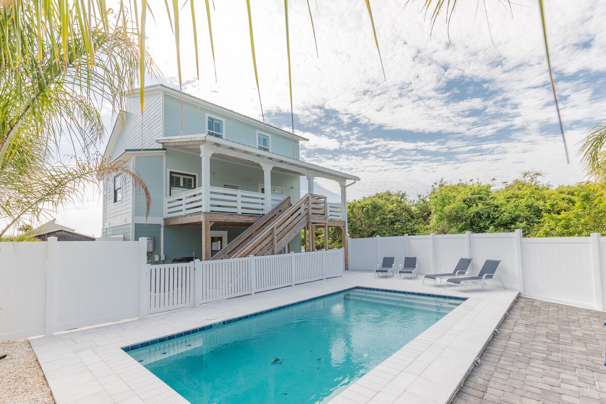 🏝️ Welcome Nights of Lights guests to your PRIVATE beach house! Walk to the beach, restaurants, arcade, coffee & yoga. 10min drive to historic downtown St. Augustine. Fenced yard, covered deck, grill, fire pit+ luxe outdoor shower. 3 bed/2 bath, sleeps 6. Kid/pet friendly. Modern kitchen. Remote workspace. 65" TV. ORIGINAL NINTENDO & 650+ games. 4 bikes, 2 chairs, + beach cart. Free coffee. Peaceful & quiet street yet close to everything. Always 5-star service hosted by hospitality pros! ✨