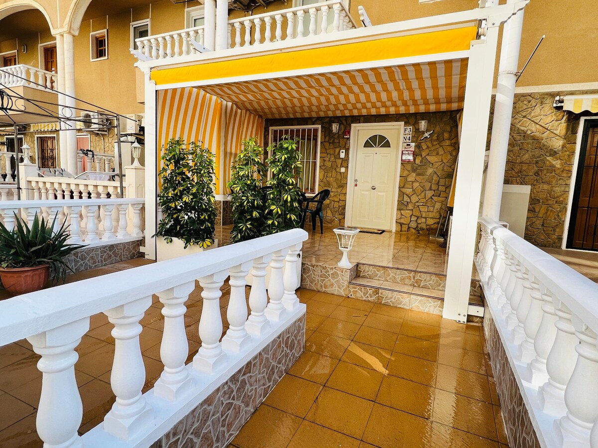 Buscando pasar unas vacaciones perfectas en la Costa Blanca? Casa Zen en Urb Pueblo Albero es un lugar perfecto para su estancia en Orihuela Costa. Con capacidad para 5 personas, frente al supermercado y bares/restaurantes, a 5 minutos a pie de cualquiera de las dos playas de La Zenia ya 10 minutos a pie del famoso bulevar La Zenia. Piscina y zona de paseo. El dúplex tiene todo lo que pueda necesitar para su estancia. Escalera con puertas de seguridad para niños. ¡Las mascotas son bienvenidas!
