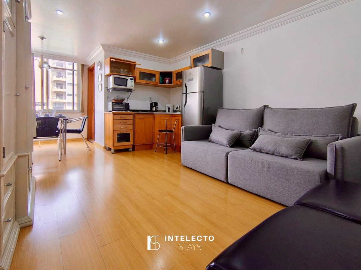 Relaxe neste espaço calmo e cheio de estilo. O espaço: 1 quartos e 1 banheiro. Quarto - Cama Queen, smat tv 42* Wi-Fi Possui utensílios de cozinha, microondas, chaleira, torradeira, máquina de café nespresso, sanduicheira, adega para vinhos, secador de cabelo. Garagem coberta. 9º andar. 6 elevadores. Roupa de cama e toalha.
