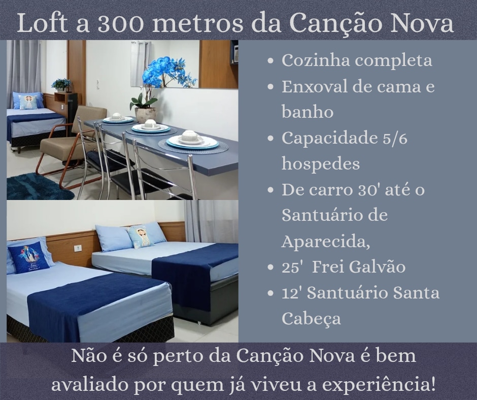 ✨ Bienvenido a su refugio en Canção Nova: comodidad, practicidad y hospitalidad a solo unos pasos del santuario. Nuestro loft es nuevo, acogedor y está preparado con cariño para hacer que tu peregrinación sea aún más especial. Aquí encontrarás un ambiente acogedor, diseñado para que te sientas como en casa🙏🏽 Hosana Brasil, estamos optando por el alquiler de 5 personas por un mínimo de 2 noches