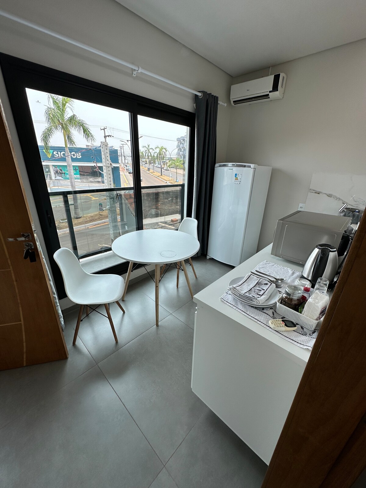 • Apê no centro de Cacoal, perto de: clínicas, hosp. particulares, os melhores restaurantes, cafeteria, gelateria, praça de lazer e prefeitura. • Apartamento com mobília completa, no quarto e sala tem: ar cond. , TV , vent. de teto. • Sala com sofá cama de casal cabe 2 pessoas até 1.80 alt. • Cozinha completa: cooktop de indução, liquidificador, forno elét., microondas, sanduicheira, bancada toda no mármore. • Máquina lavar 17kg e tanquinho. • Chuveiro água quente. • Sacada com vista pra rua.