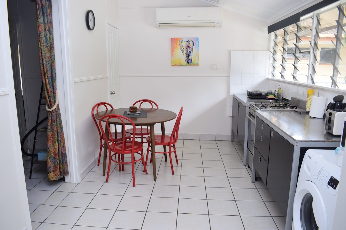 Clásico Queenslander con carácter de ciudad interior. Totalmente amueblado con 2 camas tamaño queen y 2 camas individuales. A 100 metros a pie de la estación central de tren de Cairns. A poca distancia a pie de la ciudad, el puerto, restaurantes y tiendas. Cocina totalmente equipada. Jardín tropical con cactus y suculentas. Kevin vive abajo en una unidad separada. La lavandería está abajo y se comparte con Kevin, pero está disponible y accesible en todo momento.