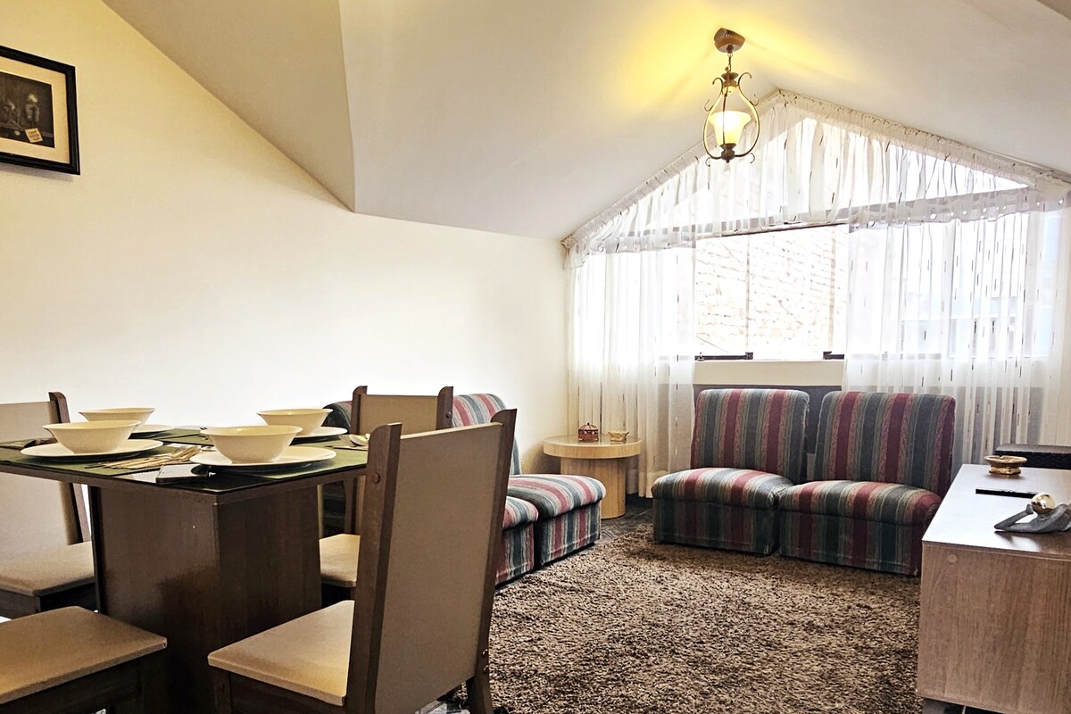 Cómodo y seguro departamento situado en el piso3 de nuestro EDIFICIO FAMILIAR, cerca de todo. En el Piso1 encontrarás una bodega con artículos de primera necesidad. Además con una ubicación estratégica: a 10 min de la Plaza de Armas y centros comerciales; a 5 min de la UNC, Terminal Terrestre y Alameda de los Incas; a 18 min del Aeropuerto. Alrededor encontrarás mercados locales, farmacias, restaurantes, etc. Mi familia y yo estamos prestos a su servicio para que disfrutes de tu estadía.