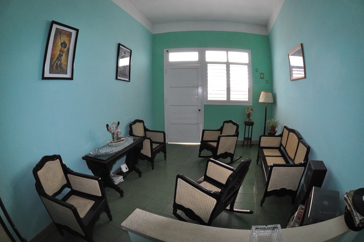 En el Centro Histórico de la Ciudad muy de cerca, restaurantes, cafés, bares, Teatro La Caridad, Casa de la Ciudad, Casa de la Música, museos, Centro Cultural El Mejunje, a 20 minutos andando del Mausoleo del Che Guevara, esta situado nuestro alojamiento. La habitación cuenta con dos camas, personales, baño privado, TV, aire acondicionado splie, refrigerador, ventilador y espejos, ubicada frente a la saleta, con cuatro sillones, periódicos, revistas y libros. No hay cortes eléctricos en casa