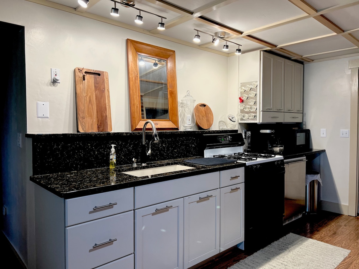 Pequeña casa de huéspedes con cocina completa. Tres camas, una cama tamaño queen, un futón completo (muy cómodo) y un sofá cama completo de IKEA. Hay un baño completo con ducha y un gran porche delantero. El dormitorio tiene dos espacios con un divisor. Hay una división para el aire acondicionado, una estufa de propano y calefacción de agua caliente. Amplio espacio para una familia con niños, tres parejas o tres solteros. Vistas de Burke. La casa de los propietarios está al lado. Tarifa de alquiler para 4 huéspedes. Tarifa adicional de 25 $ por persona para 5 o 6. Limpieza, tarifas, impuestos adicionales