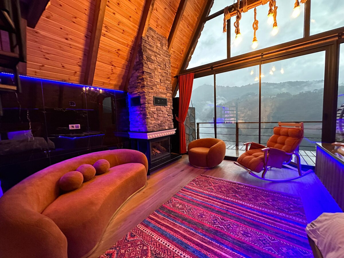 - Nuestra casa bungalow ha sido diseñada completamente de madera y auténtica. - Nuestra casa de bungalow tiene una chimenea y tiene magníficas vistas al valle y a la montaña. - Nuestra habitación tiene un ancho de 45 m2. - Es un concepto que las parejas de luna de miel pueden elegir fácilmente. - El piso inferior tiene forma de sala de estar; hay una cama doble en el piso superior, como balcón, sofá, baño, TV, minibar, etc.