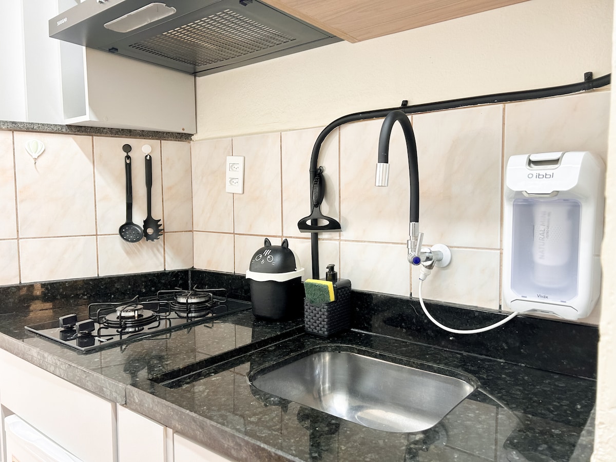Estudio moderno en el corazón de Cambuí, con garaje exclusivo, Wi-Fi Vivo Fibra 200 Mbps, nueva TV inteligente con Netflix y cocina equipada. Ideal para el ocio o el trabajo remoto. Aire acondicionado portátil, área de servicio con tanque y tendedero (sin máquina). Ubicación inmejorable: a 3 minutos de Pão de Açúcar, Centro de Convivência, farmacias y bares como Citybar y Citytortas. Llegada autónoma y conserje virtual con monitoreo 24/7. ¡Anfitrión atento y siempre disponible en el chat!