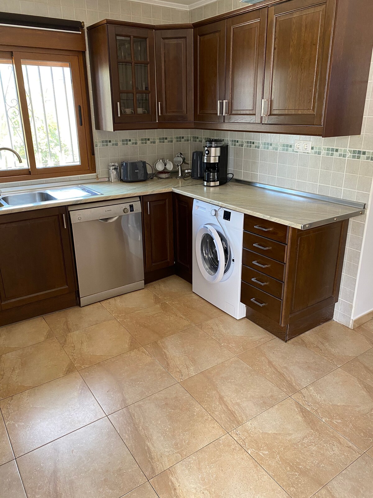 Bungalow en alquiler en planta baja en urbanización cerrada con 2 piscinas en Ciudad Quesada. La superficie total es de 85 m2, consta de 2 dormitorios, un amplio salón, una cocina, dos baños, 2 terrazas. Hay una plaza de aparcamiento. El apartamento tiene todo lo que necesita para una vida cómoda y recreativa: muebles nuevos, electrodomésticos (incluida una cafetera, tostadora, lavavajillas), vajilla, ropa de cama y toallas. El apartamento está equipado con aire acondicionado