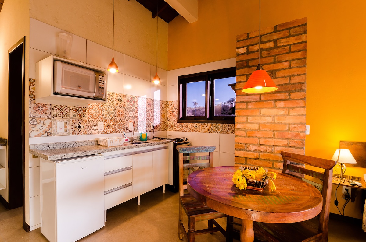 Com acesso exclusivo ao telhado, o destaque é a vista da lagoa. O banheiro integrado ao quarto oferece uma vista incrível. A cozinha é bem equipada com forno elétrico, fogão de 5 bocas, geladeira com freezer e utensílios. O espaço de estar, inclui um sofá, mesa de centro e uma mesa para refeições. Um quadro de Buda sobre a lareira cria uma atmosfera serena. A qualidade das roupas de cama e banho supera expectativas. A água das torneiras é própria para beber, aquecida por energia solar.