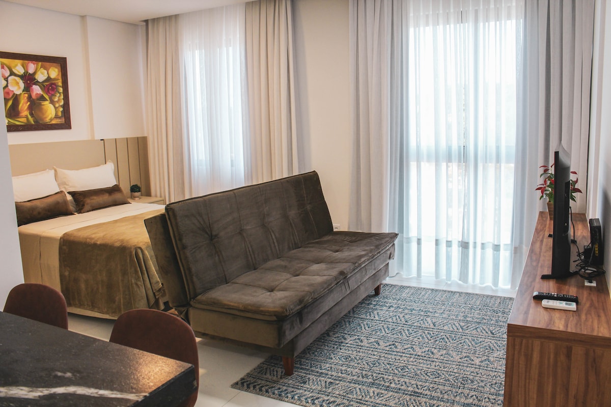 Sofisticado apartamento tipo estudio ubicado a 800 metros del parque Vila Germânica, lugar de eventos como el Oktoberfest. Rodeado de restaurantes, bares y supermercados. Todo para su comodidad: Smart TV 50" Samsung, aire acondicionado split, ducha de gas, wifi fibra 240mb, cocina completa con heladera Brastemp, microondas, horno, estufa, campana extractora, cafetera, purificador de agua, lava y seca, armarios, y por supuesto ¡una cama queen con el mejor colchón!