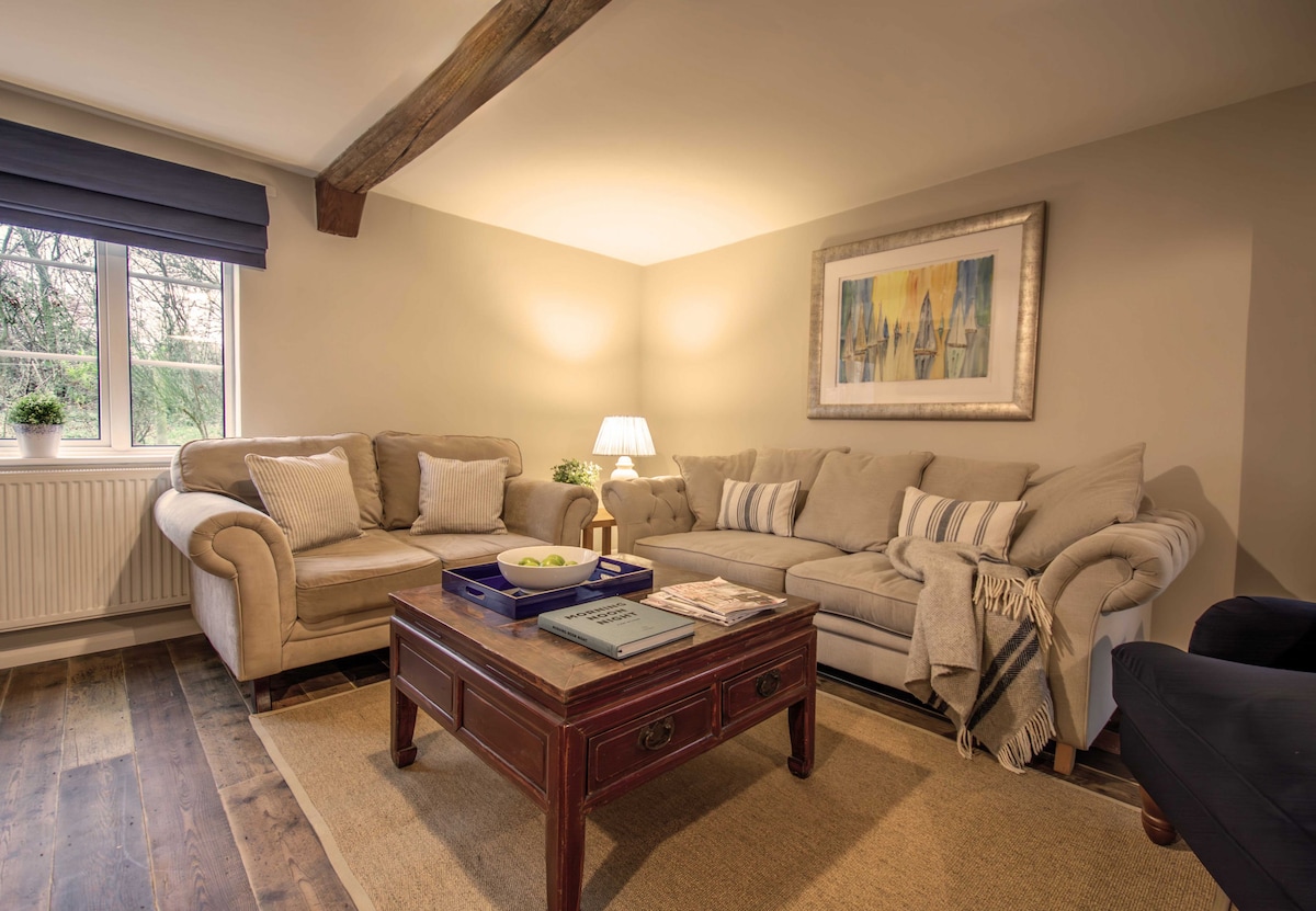 Water Meadow Cottage. A gorgeous 3-bedroom house, comfortably sleeping 6, ideal for families and anyone to unwind in all seasons. With a private south-facing garden full of flowers and birds, and secluded patio with delightful views across meadows. The stunning living room with original beams and bright windows is inviting in summer, and so cosy in winter with its wood-burning stove. Nestled in beautiful quiet countryside, a short drive from the coast, and Aldeburgh, Thorpeness, Orford.