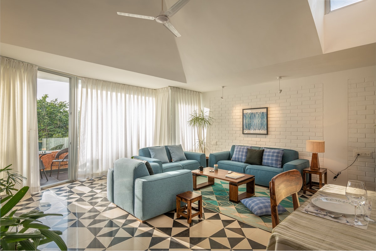 Modern Boho Apartment | Minutes from North Goa's Beaches.A cozy, fully furnished 1BHK retreat on ground floor perfect for couples, friends, or small families. Highlights: - Stylish Boho Interiors with a warm vibe - AC in bedroom & living room for comfort - Smart TV + High-speed WiFi - Equipped kitchen with RO water, cooktop, fridge & washing machine - Shared swimming pool (9 AM–6 PM | swimwear mandatory - On-site gym available at INR 200/-per person per day - 24/7 security - Free Parking