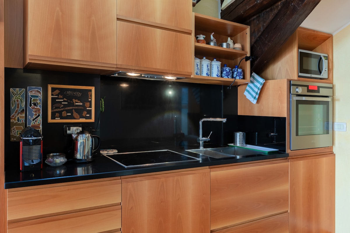 In the heart of Venice, 3 minutes from San Marco and 6 minutes from Rialto, Cà Laura has been designed to make you enjoy a true Venetian experience to the fullest, enjoying a splendid view of one of the most characteristic canals of the city'. It consists of a full kitchen, with dishwasher, washing machine, oven, microwave, Nespresso machine and Alessi dishes and glasses and pots. Double bedroom, sofa, 44-inch TV, fiber Wi-Fi, air conditioning in both the bedroom and the living room.