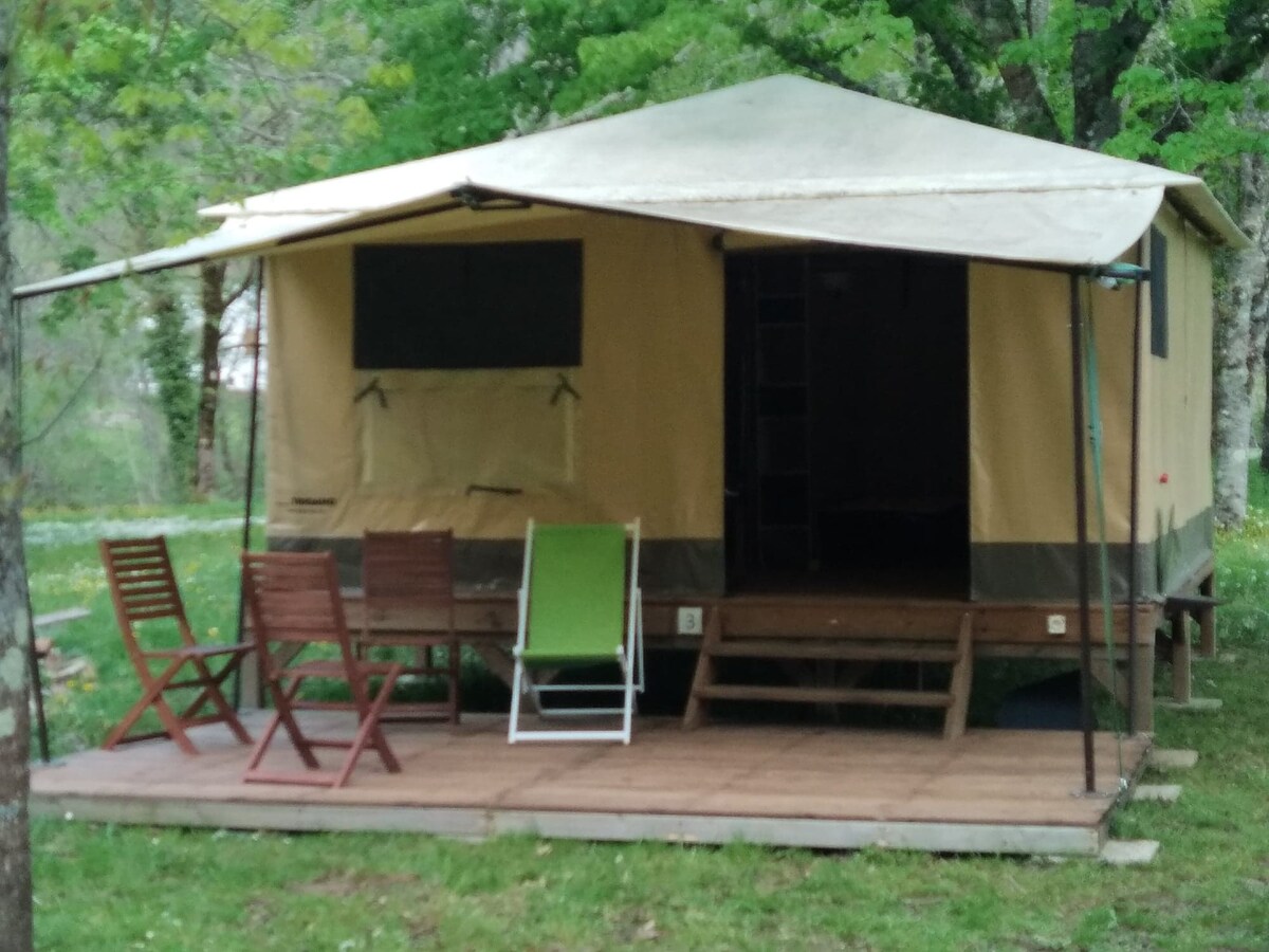 Las alegrías del descanso y de las vacaciones en plena naturaleza sin las limitaciones del montaje de la tienda con instalaciones de calidad La superficie de la Tienda Glamping es de 24 m2 en una terraza de 30 m2. Tiene una zona con vistas panorámicas a las montañas desde la zona de estar y desde la cama doble, una zona de cocina y una zona para dormir a los niños. Las tiendas de campaña Glamping son con una cocina exterior cubierta. Sin baño pero cerca del sanitario.