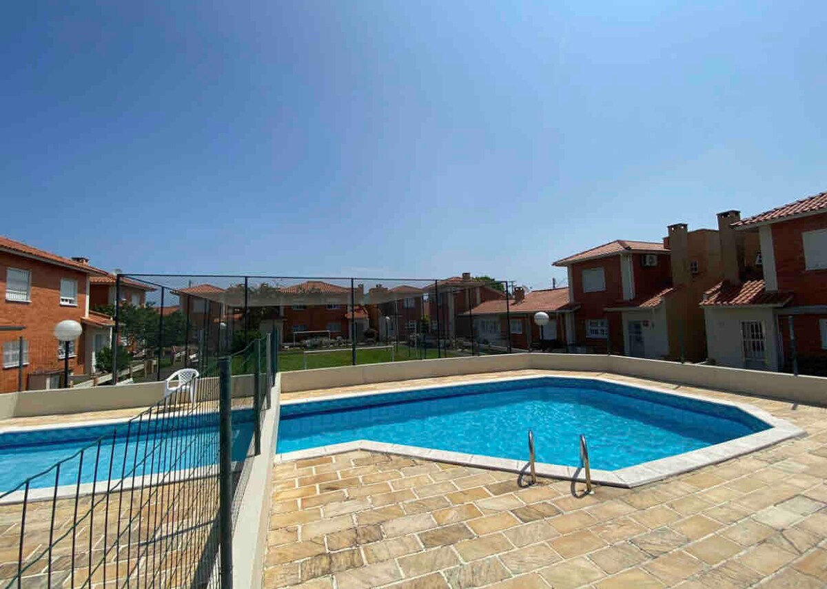 Moderno adosado en condominio con piscina, sala de juegos, salón de baile, cancha de fútbol, parque infantil. Casa reformada con porcelana , barbacoa, dos dormitorios y baño en el segundo piso , sala de estar con cocina y sala de televisión con una cama , inodoro , área de servicio y patio. Internet en el condominio.Ventanas con pantalla y rejilla.No se acepta mascota. En el año nuevo y carnaval período mínimo de 6 días para el alquiler