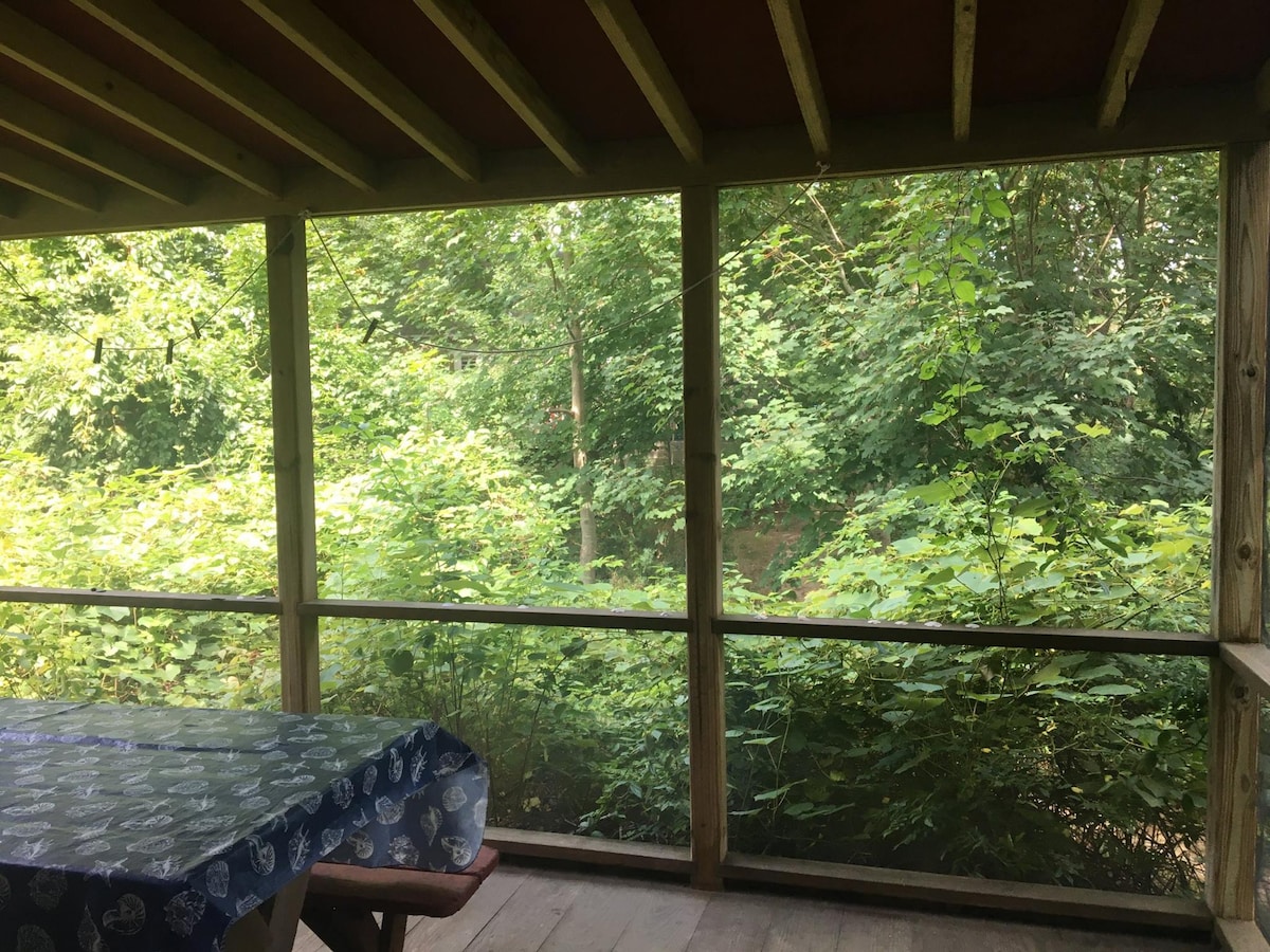 Una casa de campo rústica construida en 1940 enclavada en el bosque. Esta escapada sin lujos ofrece un escalón por encima del camping, con agua caliente corriente y una cocina completa. Acceso a la playa privada al otro lado de la calle. Este es un refugio básico sin wifi, aire acondicionado, televisión ni servicios modernos (simples cerraduras con gancho y ojos). Los huéspedes traen sus propias sábanas y artículos de aseo
