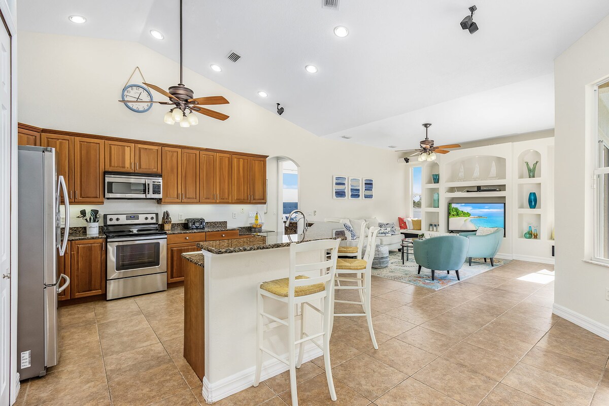 ¡Ubicación, ubicación, ubicación! Casa tranquila de 3 dormitorios y 2 baños en un canal con porche privado y piscina grande con spa de chorros. Pesca desde el muelle, trae tu propio barco o alquila uno, o simplemente pasa el rato con familiares y amigos. ¡A poca distancia a pie de restaurantes populares como Lobster Lady, Rumrunners, Fathoms y muchos más! La tienda de comestibles Publix se encuentra a pocos pasos. En bicicleta a Cape Harbor para conciertos y restaurantes. Salón, comedor y sala familiar de concepto abierto que se conectan con el hermoso Lanai .