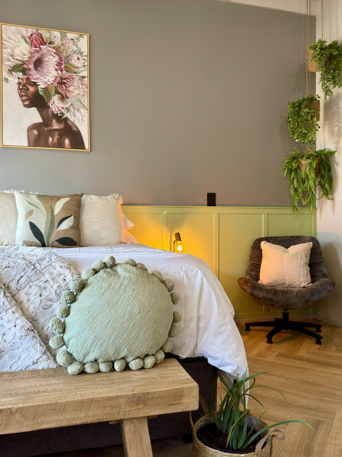 Bienvenido a The Sanctuary (vistas a la montaña de la Mesa) Las aves coloridas y las profundas esmeraldas te sumergen al entrar en este exuberante espacio. Equipado con la mejor ropa de cama y acabados que te dejarán sin aliento. Una cocina americana totalmente equipada está a tu disposición. El salón es perfecto para esas cómodas noches de cine. En este espacio encontrarás un comedor/estación de trabajo multiusos debajo del televisor de 50 pulgadas (wifi rápido y seguro) con un balcón con vistas a la montaña de la Mesa.