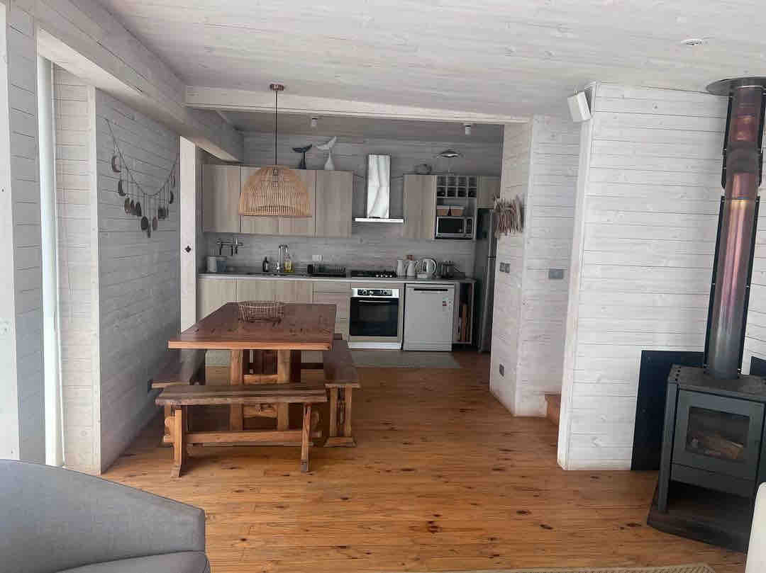 Te esperamos en nuestra cabaña con dos dormitorios, dos baños, cocina, comedor, terraza, sala de estar y estacionamiento. Ven a disfrutar de la tranquilidad de este espacio a pasos de la playa. Desconéctate con la privilegiada imagen del cielo nocturno, el amplia área exterior para compartir con un asado o simplemente tomar el sol.