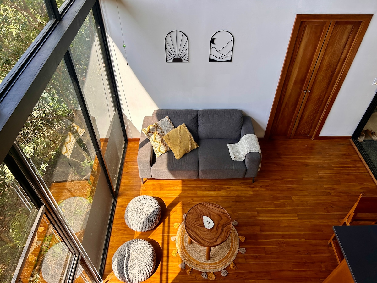 Despiértate en una impresionante villa en forma de A suspendida sobre el suelo del bosque, donde el diseño contemporáneo se une a la serenidad de la montaña. Ubicada en el exuberante dosel de Santa Elena en Monteverde, esta casa diseñada por arquitectos en Sukha Monteverde ofrece la combinación perfecta de comodidad, estilo y proximidad a las principales atracciones del bosque nuboso de Costa Rica Si buscas aventura, romance o tranquilidad, esta elegante cabaña en forma de A ofrece una experiencia inolvidable en una de las zonas con mayor biodiversidad de la Tierra.