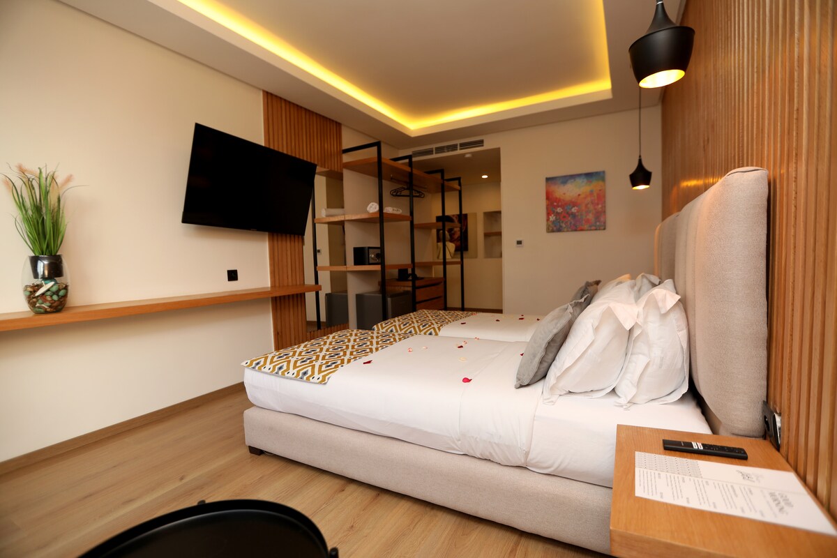 ADAY Hotel Casablanca is a 4-star hotel offering modern air-conditioned rooms with free Wi-Fi, minibar, and flat-screen TV. It serves a buffet breakfast at the restaurant at 12 Euros per person, per day.