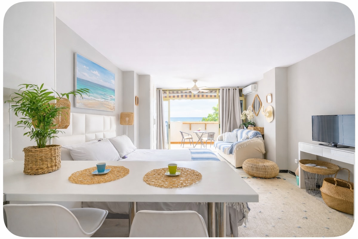 Alójate en la primera línea de playa de Marbella en este estudio de 40 m² con terraza lateral con vistas al mar, cama tamaño king + sofá cama, aire acondicionado, ventilador de techo, TV inteligente y wifi de alta velocidad, y lugar de trabajo privado. Disfruta de 2 piscinas: una a nivel del mar y otra en la azotea con vistas panorámicas. Cocina totalmente equipada, servicios de playa y tabla de SUP disponibles. A unos pasos de cafeterías, tiendas y atracciones. Trona, cuna, juegos y libros a petición. No se necesita auto. ¡Perfecto para parejas, familias pequeñas o amigos!