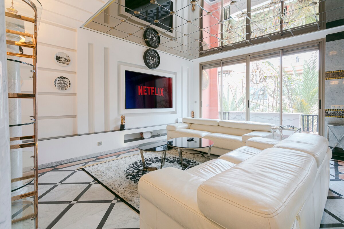 Experiencia inmersiva en un apartamento-galería contemporáneo. Perfectamente situado en el Triángulo de Oro festivo, a 15 min a pie de la medina. Este apartamento de muy alta gama de 140 m2 luminoso y acogedor. A dos pasos de los palacios emblemáticos (Mamounia, Sofitel, Casino) Residencia de prestigio con piscina. Ideal para hasta 5 huéspedes, ofrece 2 habitaciones, 3 terrazas, 2 baños y 3 aseos. Entre un ambiente moderno y animado, le espera una experiencia única en el corazón de Marrakech.